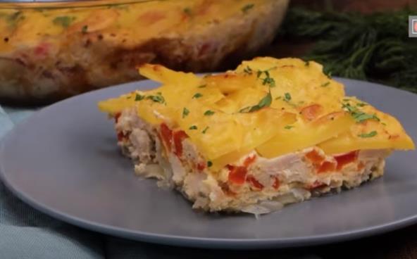 Crni luk isecite na režnjeve i poređajte u tepsiju. Piletinu isecite na kockice, pa pomešajte sa jajima, kačkavaljem, seckanom papriom i belim lukom, posolite i pobiberite. Sjedinite. Sipajte preko luka i lepo poravnajte. Preko poređajte krompir sečen na kolutove, prelijte maslinovim uljem i posolite. Pecite u rerni na 180°C sat vremena.