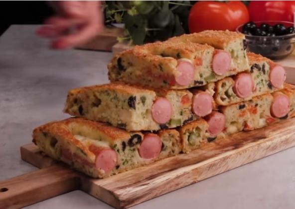 Jaja posolite i pobiberite, pa umutite. Dodajte ulje i mleko, pa nastavite da mutite. Dodajte brašno i prašak za pecivo, pa umutite testo. Tu stavite seckane krastavčiće, masline, peršun, kačkavalj i paradajz. Luk iseckajte na sitno i propržite, pa dodajte u smesu zajedno sa origanom. Promešajte da se sve sjedini.