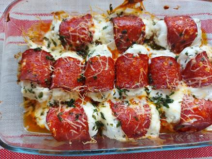 Preliti njoke i svaku njoku prekriti listom kobasice. Posuti ostatkom kačkavalja i peršunovog lista. Zapeći u rerni koko 25 min na 200 stepeni.