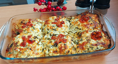 Odozgo narendajte drugi deo kačkavalja. Ja sam ukrasila čeri paradajzom. Peći na 190 stepeni 50-60 min. Služiti uz salatu i obavezno neku čorbicu ili supu.