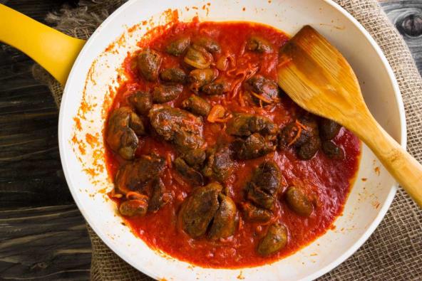 U tiganj sipajte malo ulja. Crni luk očistite i isecite na šnite. Potom u zagrejano ulje stavite da se luk dinsta. Nakon 2,3 minuta sipajte džigericu i malijte sa malo vode. Smanjite vatru da se dinsta na laganoj vatri. Posle oko 15 minuta dodajte kuvani paradajz. Promešajte. Vodite računa da vam tada ne zagori.