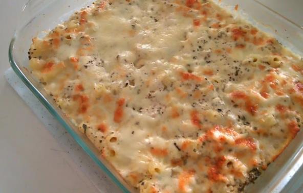 Meso sitno iseckajte. Vatrostalnu činiju nauljite, pa sipajte makarone i preko belo meso. Jaja umutite, pa dodajte jogurt, ulje i sir. Promešajte pa dodajte so, biber, suvi začin i bosiljak, kao i vodu. Sjedinite i prelijte preko makarona i mesa. Lepo promešajte i prekrijte folijom. Pecite na 200°C oko 30-35 minuta. Zatim skinite foliju, dodajte rendani kačkavalj i vratite u rernu na 10 minuta.
