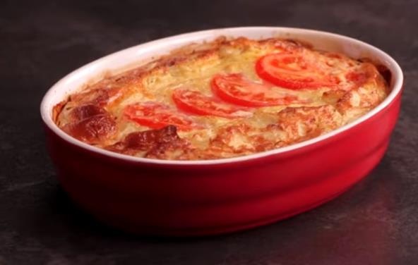 Crni luk iseckajte i stavite u manju tepsiju. Preko stavite meso isečeno na kockice. Posolite i pobiberite. Jaja i pavlaku za kuvanje umutite. Dobro pobiberite i prelijte preko mesa. Paradajz isecite na kolutove i posložite preko preliva. Pecite u rerni na 180°C nekih 40-50 minuta.