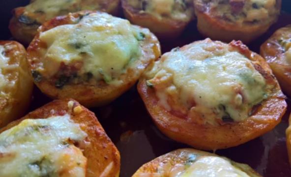 Polu pečeni krompir napunite pripremljenom smesom i između krompira sipajte paradajz sos. Vratite u rernu na 180°C još 30 minuta. Nakon tog vremena izvadite iz rerne, pospite preostalim kačkavaljem i vratite da se peče još 10 minuta.