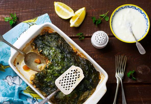 4. Zatim iseckajte blitvu i veoma je malo propržite i začinite, pa sipajte preko mesa, sve prelijte umućenim jajima, mlekom i pavlakom i zapecite na 250 stepeni 15 minuta.
