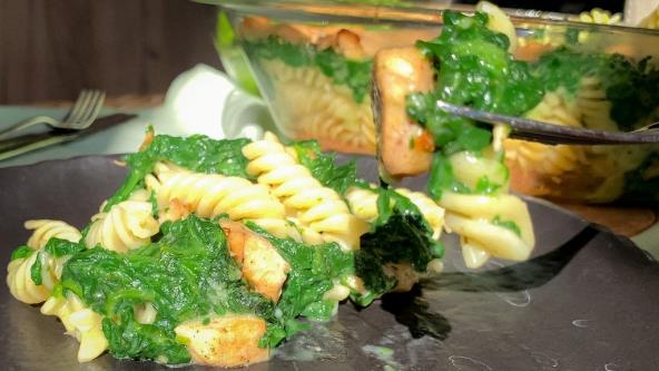 Zapečene makarone sa svima omiljenim sastojcima - spanaće, bešamelom i piletinom. Ima li šta lepše za ručak?
