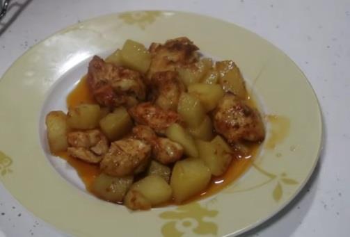 Krompir isecite na kockice, začinite sa suvim začinom i začinskom paprikom, sipajte malo maslinovog ulja i promešajte. Piletinu isto isecite na kockice, sipajte preko začin za piletinu, so i začinsku papriku, pa lepo sjedinite.