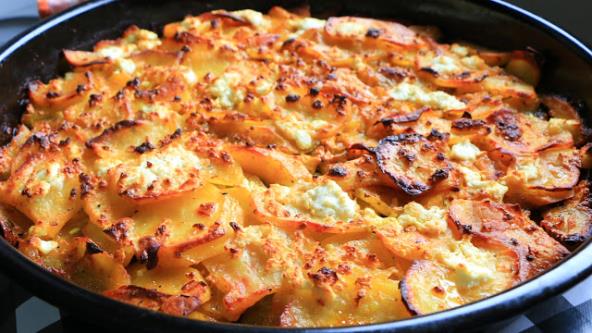 Iseckajte luk na sitno i krompir na kolutove. Stavite u tepsiju, dodajte začine i promešajte. Odozgo izmrvite sir, pouljite i dodajte vodu. Pecite na 200°C oko 30-40 minuta.