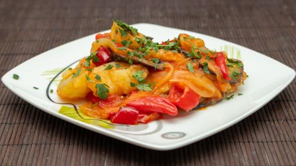 Isecite krompir na kolutove i stavite u hladnu vodu. Patlidžan isto na kolutove isecite, posolite i odložite na pola sata. Na ulju propržite seckan crni luk, zatim dodajte beli luk i nalijte sokom od paradajza. Posolite, dodajte kašiku šećera i kašiku brašna. Kuvajte dok se ne zgusne.