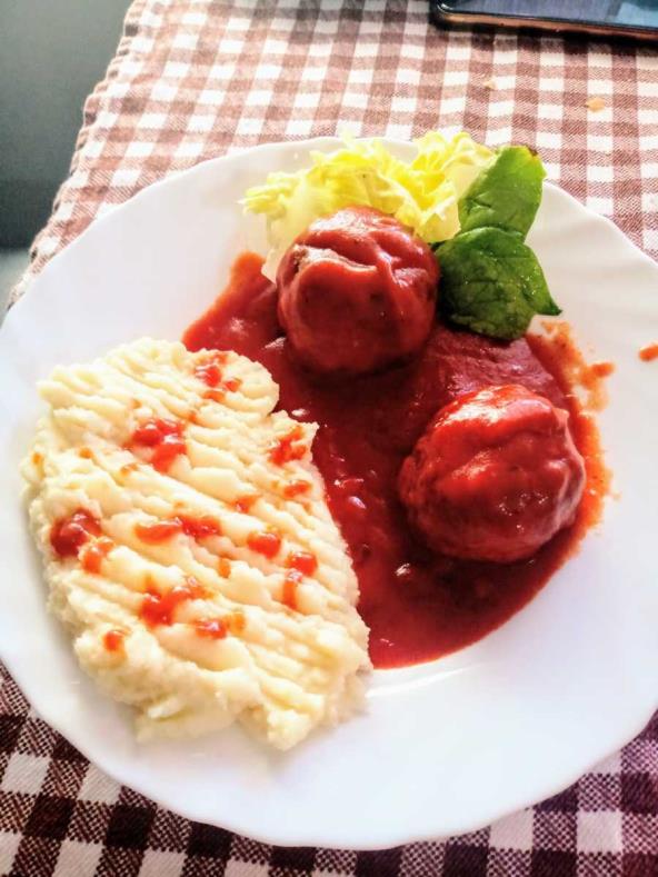 Sitno iseckati crni i beli luk. Pomešati sa mlevenim mesom. Dodati jedno jaje, 6 kašika prezli (po potrebi više), malo mlevenog bibera, kašika suvog biljnog začina. Sve to dobro sjediniti i ostaviti da odstoji u frižideru oko sat vremena. Nakon toga praviti osrednje loptice, a zatim ih propržiti u ulju na laganoj vatri dok dobro porumene sa svih strana. U istom ulju dodati kašiku brašna i odmah zatim paradajz sos i 250 ml vode. Dodatno začiniti sos. Zajedno sa ćuftama krčkati jos 20-tak minuta na laganoj vatri. Poslužiti uz pire krompir.