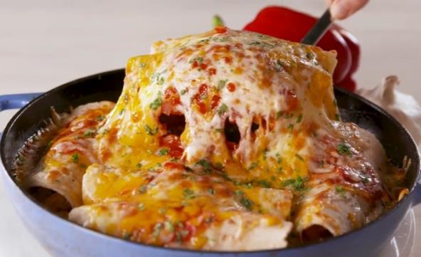 Usitnite piletinu, pa pomešajte sa šoljom rendanog čedara, kačkavaljem i seckanim korijanderom. Dodajte salsa sos koji ste ostavili u konzervi, posolite i sjedinite sve. Filujte tortilje, urolajte i ređajte u tiganj u kojem je sos. Prelijte enčilade sa pola šolje sosa koji ste uzeli iz tiganja i pospite sa preostalom šoljom čedar sira i kačkavalja. Pecite 10 minuta na 180°C, pa pospite seckanim korijanderom.