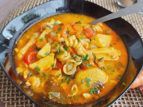 Prodinstati i dodati crvenu papriku, i sečen krompir kao i sečen paradajz pa naliti vodom i kuvati oko 20 min.