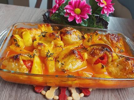 U činiju staviti brašno i sipati kuvan paradajz i još toliko vode. Izjednačiti i preliti paprike. Još ih malo pouljiti i peći na 210 stepeni oko 50 min. da lepo zarumene.