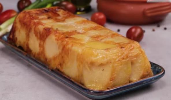 Isecite krompir na tanje kolutove (kao za musaku). U tepsiju dimenzija 7x20 cm poređajte po dnu krompir i po ivicama. Zatim preko stavite listove kačkavalja, takođe i po ivicama.