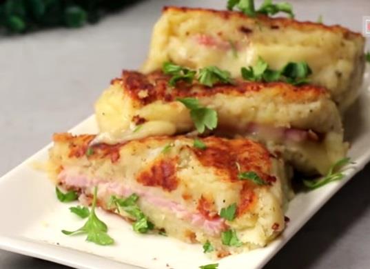 Skuvajte krompir, začinite, dodajte prezle i promešajte. Uzmite komad tog krompira i napravite kvadrat (kao tost) stavite preko šunku, kačkavalj i još jedan kvadrat od krompira. Pržite na malo ulja po 5 minuta sa svake strane.