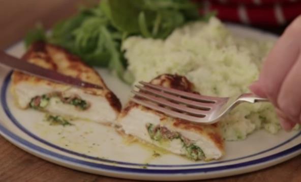 Na piletini napravite mali džep, pa posolite i pobiberite. Maslac narežite na kriške i stavite u svaki džep mesa, zajedno sa slaninom.