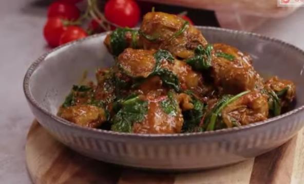 Ljutu papriku i luk isecite i propržite na ulju. Dodajte batake i začine, pa promešajte. Dodajte vodu, iseckan paradajz, poklopite i kuvajte pola sata. Zatim dodajte spanać i kuvajte poklopljeno još 15 minuta na niskoj temperaturi.