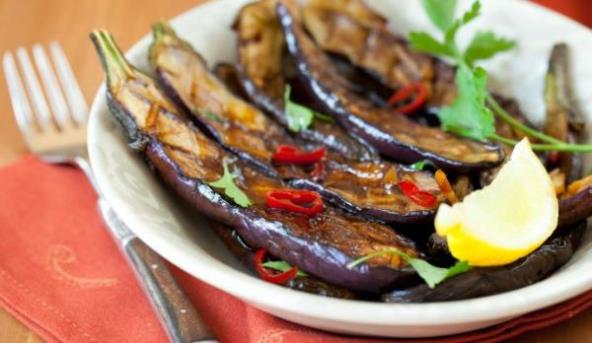 2. Iscediti patlidžan i posušiti ga salvetom ili papirnim ubrusom. Iseckati beli luk. Premazati plavi patlidžan maslinovim uljem i peći na roštilju 2 – 3 minuta. Okrenuti, premazati uljem i posuti belim lukom. Peći još malo i skinuti sa roštilja.