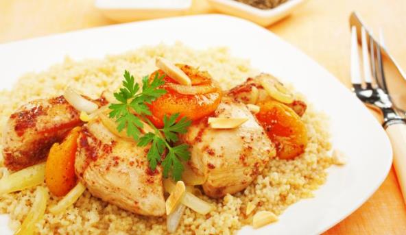 3. U posudu sipajte sve ostale sastojke, sem suvih kajsija i promešajte. Prelijte time piletinu, pa preko poređajte kajsije.