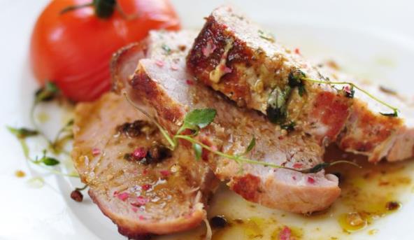 3. Jagnjetinu pržiti u tiganju sa duplim dnom na visokoj temperaturi sa svih strana po 1 minut, a zatim izvaditi. U tiganju na malo maslaca izdinstati mešavinu začina i paradajz. Doliti belo vino, pa ostaviti da se sve skuva. Meso začiniti solju i biberom. Preostali maslac u trakama dodavati mesu. Servirati ukrašeno cvetovima biljaka. Jesti uz pečeni hleb.