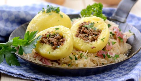2.Meso pomešati sa začinskim biljkama. Od testa sa krompirom oblikovati 8 knedli, pa svaku napuniti sa malo mlevenog mesa. Knedle kuvati 10 minuta u dosta ključale slane vode. Rernu zagrejati na 200 stepeni.