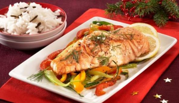 2. Rernu zagrejte na 200 stepeni. U pripremljenu posudu (najbolje vatrostalnu) stavite paprike i luk pa ih zalijte vrućom supom. Komade lososa posolite i pobiberite, poslažite po povrću, pospite komoračem, pokapajte uljem, pokrijte (poklopcem ili aluminijumskom folijom) i sve zajedno dinstajte u rerni 20 minuta. Izvadite jelo iz rerne, maknite poklopac i po želji pospite krupno mlevenim biberom.