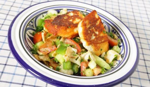 5. Šnicle od sira sa svake strane po tri minuta pržiti na masnoći zagrejanoj na umerenoj temperaturi. Staviti na tople tanjire, služiti sa pripremljenom salatom.