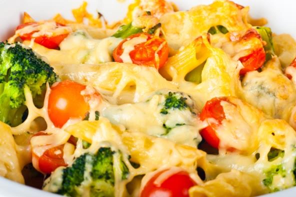 1. Skuvati pastu prema uputstvu s pakovanja. Očistiti i usitniti povrće. Brokoli iscepkati na cvetove, šargarepe,tikvice i paradajz iseći na kolutove. Brokoli blanširati oko 3 minuta i procediti. Zagrejati rernu na 180 stepeni.