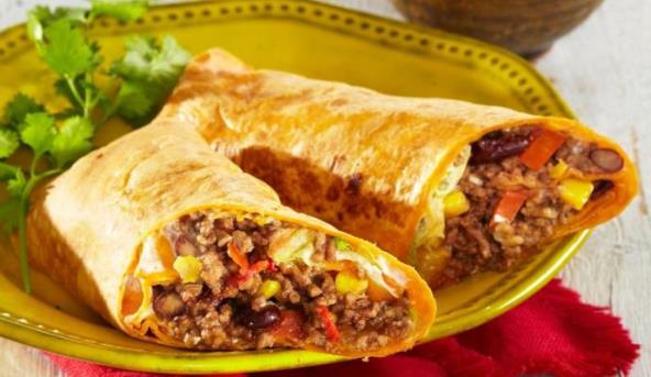 4. Tortilje blago zagrejte u rerni, pazite da se ne prepeku. potrebno je da ostanu mekane. na svaku tortilju stavite po 2 kašike nadeva, zarolajte i poslužite.