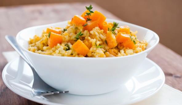 6. Kada je pirinač skuvan, dodajte pečenu bundevu, rendani parmezan, iseckan korijander i ukrasite začinima po želji.