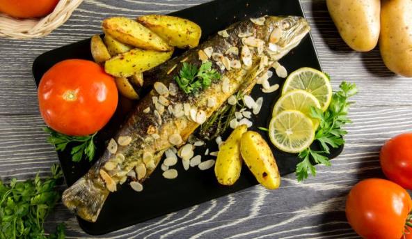 3. Preostale cele bademe stavite u zasečeni deo ribe. Pecite ribu u pokrivenoj vatrostalnoj posudi na 200° C.