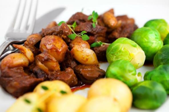 4. Luk presuti u šerpu s mesom i dodati u malo vode razmućeni gustin. Krčkati 5 minuta. Posoliti i pobiberiti. Servirati uz krompir i prokelj.