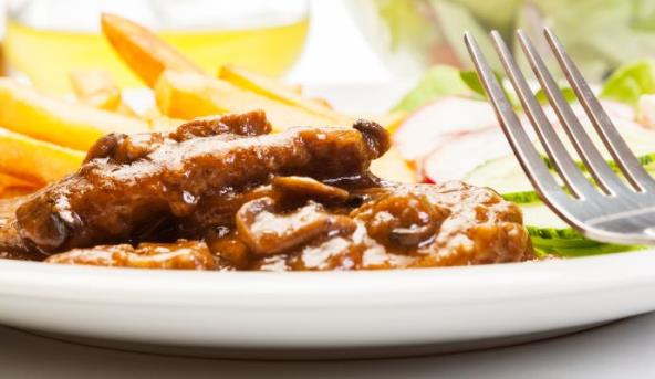 1. Luk oljuštite i narežite na kockice, a šampinjone na listiće. Odreske operite i dobro osušite.