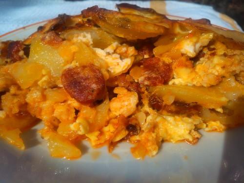 Iseckati crni luk i propržiti na ulju, dodati sitno iseckano pileće meso ( ja sam ga samlela u secku) na kolutiće kobasicu, dodati seckan beli luk, začin, alevu papriku i još posoliti po ukusu. Krompir očistiti, oprati i iseći na tanke kolutiće. Ređati u stakleni đuveč i na polovini sipati pripremljen fil. Prekriti ga drugom polovinom krompira. U tanjir izmutiti jaja i mleko i preliti musaku. Poklopiti i peći na 200 stepeni C oko sat vremena.