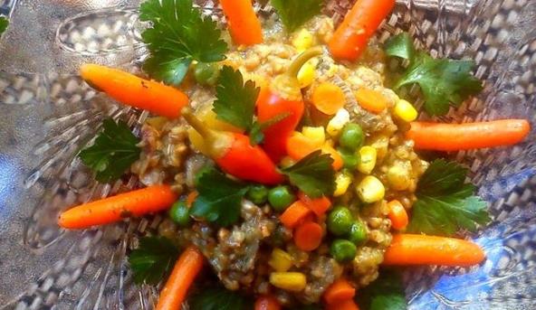 2. Mladi luk sitno iseckati i propržiti par minuta na vrelom ulju, zatim dodati seckanu šargarepu, pečurke, kukuruz i grašak. Dinstati uz povremeno dodavanje vode, po potrebi, 10-tak minuta. Sjediniti povrće sa heljdom.