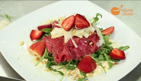 4. Zatim krenite sa slaganjem bifteka (isečenog na tanke listiće). Bitek mora da bude svež.