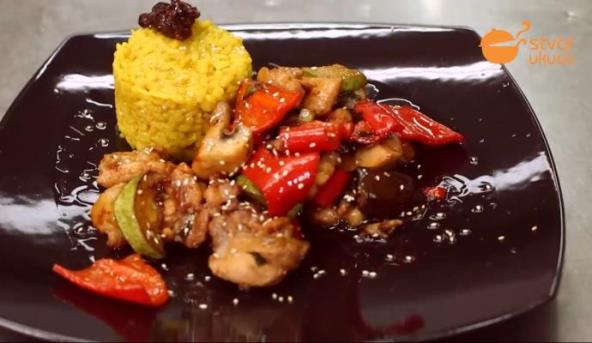 3. Kada batak počne da dobija glazuru u tiganj ubacite prethodno naseckano povrće (tikvice, šampinjone, mladi luk, crvenu papriku, patlidžan, svež karfiol) i čen belog luka. Pržite još 10ak minuta.