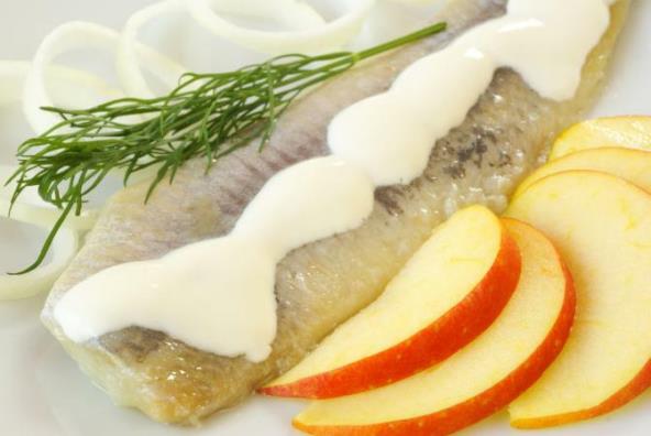 2. Staviti filet haringe na tanjir, preliti sosom i ukrasiti po želji jabukama i lukom.