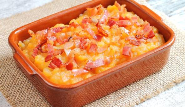 2. U posudi srednje veličine umutite jaja i mleko. Posolite i pobiberite, a zatim dodajte iseckan krompir. Umešajte polovinu slanine. Smesu sipajte u pleh za pečenje i odozgo pospite ostatkom slanine.