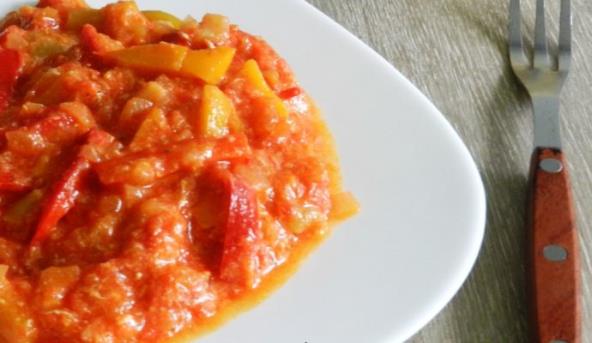 Na dve-tri supene kašike maslinovog ulja propržite na kocke iseckan crni luk, dodajte sitno iseckanu ljutu papričicu i na kocke ili trake iseckane paprike. Pržite poklopljeno, na umerenoj vatri, oko 10 minuta, pa dodajte oljušten i iseckan paradajz, šećer, so i biber, poklopite i krčkajte oko 15-20 minuta. Povremeno promešajte. Na kraju doterajte ukus solju i biberom.