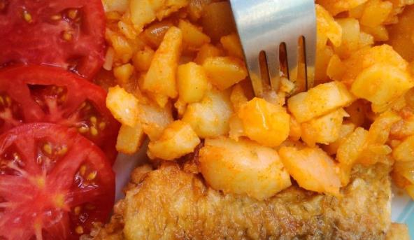 2. Luk iseći na sitno i ispržiti da porumeni, skloniti sa šporeta. U to dodati papriku, mešavinu začina, biber i na kocke isečen i očišćen kuvan krompir.