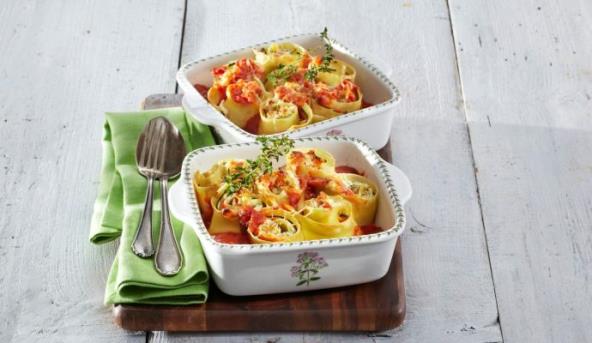 7. Rolnice stavite u pleh za pečenje. Prelijte sosom od paradajza i pospite rendanom gaudom.