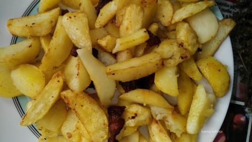 Slaninu isecite na sitnije rež jeve i propržite je na suvom tiganju da bude reš i da se istopi. Izvadite je rešetkastom kašikom pa dodajte u tu masnoću još šoljicu ulja. Krompir očistite isecite po dužini ili na četvrtine posolite začinom i kad se ulje dobro ugreje sipajte krompir. U to dodajte onu prženu slaninu malo protresite i poklopite. Okrećite tek kad se dobro zapeče. Pečen krompit vadite u tanjir i služite toplo. Servirajte sa domaćom supom ili pak supom iz kesice i nekom od Vaših omiljenih salata.. Prijatno dragi moji