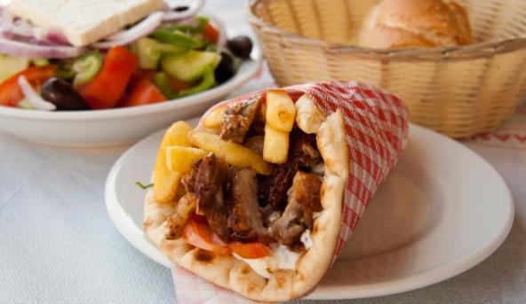 3. Testo premazati sa caciki sosom, na njega staviti meso i dodati malo sitno nasečenog crvenog luka ili neko drugo sveže povrće po izboru. Služiti uz pomfrit.