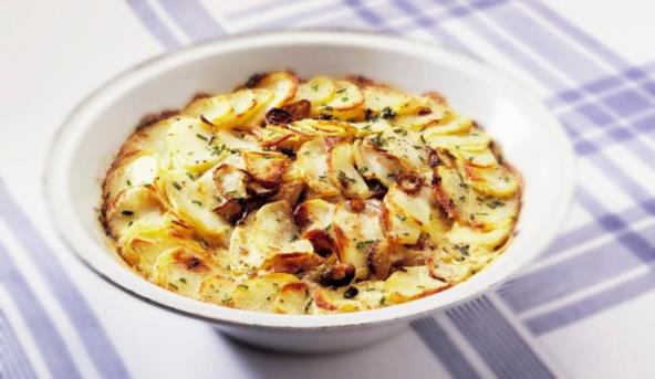 2. Preko sosa stavite iseckan krompir u nekoliko slojeva a između svakog sloja nanesite otopljen puter. Preko poslednjeg reda krompira pospite kačkavalj. Pecite u zagrejanoj rerni oko 40 minuta dok površina ne porumeni.