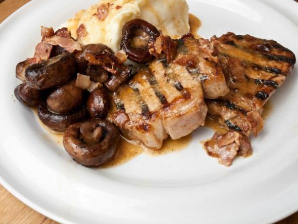 4. Iseckati luk i propržiti ga na maslacu. Iseckati pečurke i dodati luku. Naliti pavlakom, posoliti i pobiberiti. Servirati medaljone uz sos od pečuraka i pire krompir.