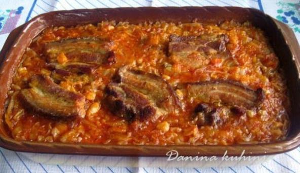 5. Kuvan pasulj vaditi rešetkastom kašikom u keramičku posudu za pečenje, (kuvano dimljeno meso ostaviti po strani). Dodati kuvani kupus oceđen od tečnosti i prženi luk i beli luk protisnut kroz presu. Sve dobro izmešati, dodati so, mleveni biber, mleveni korijander i preliti s 2 dl soka od paradajza. Po vrhu poređati kuvano dimljeno meso.