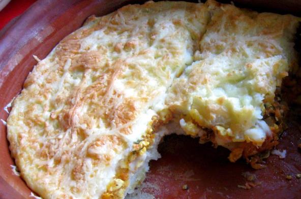 5. U posudu za pečenje podmazanu uljem, staviti jednu polovinu pire krompira, a preko prženo meso, pa drugu polovinu pire krompira. Po vrhu izrendati 100 g kačkavalja.
