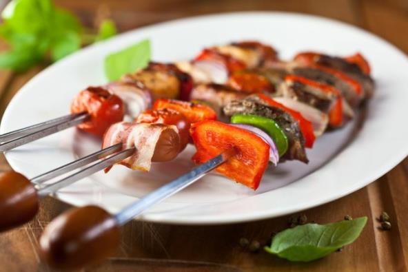 3. Peći ražnjiće na roštilju oko 10–12 minuta i servirati ukrašene začinskim biljem, uz baget ili krompir, po želji.