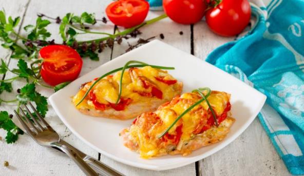 3. Stavite šnicle u tepsiju, posolite, pobiberite, a odozgo poređajte kriške paradajza, pospite peršunom.